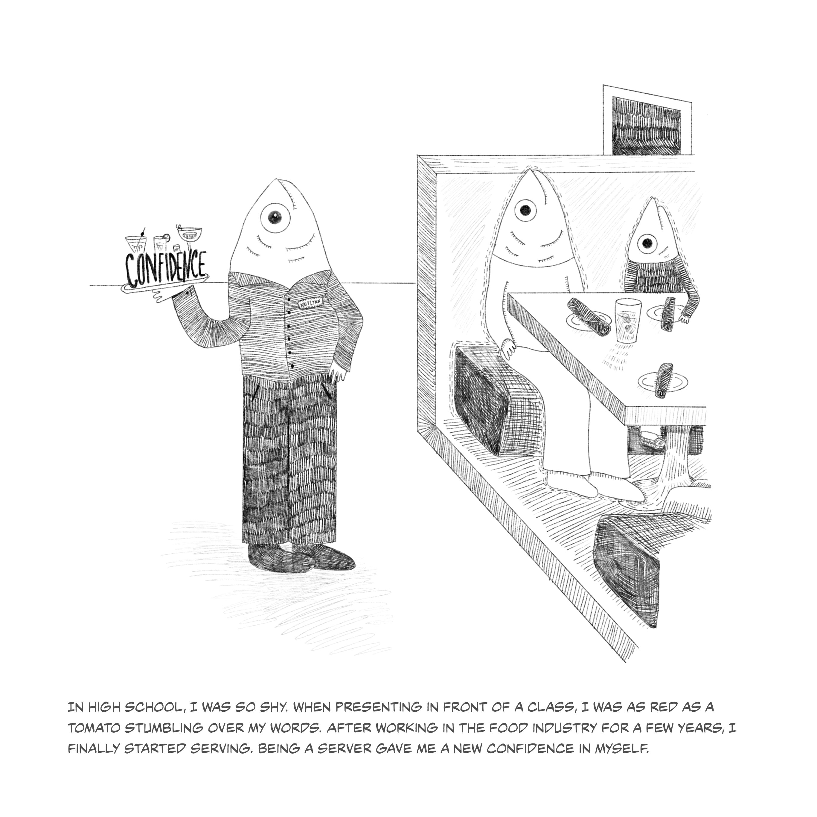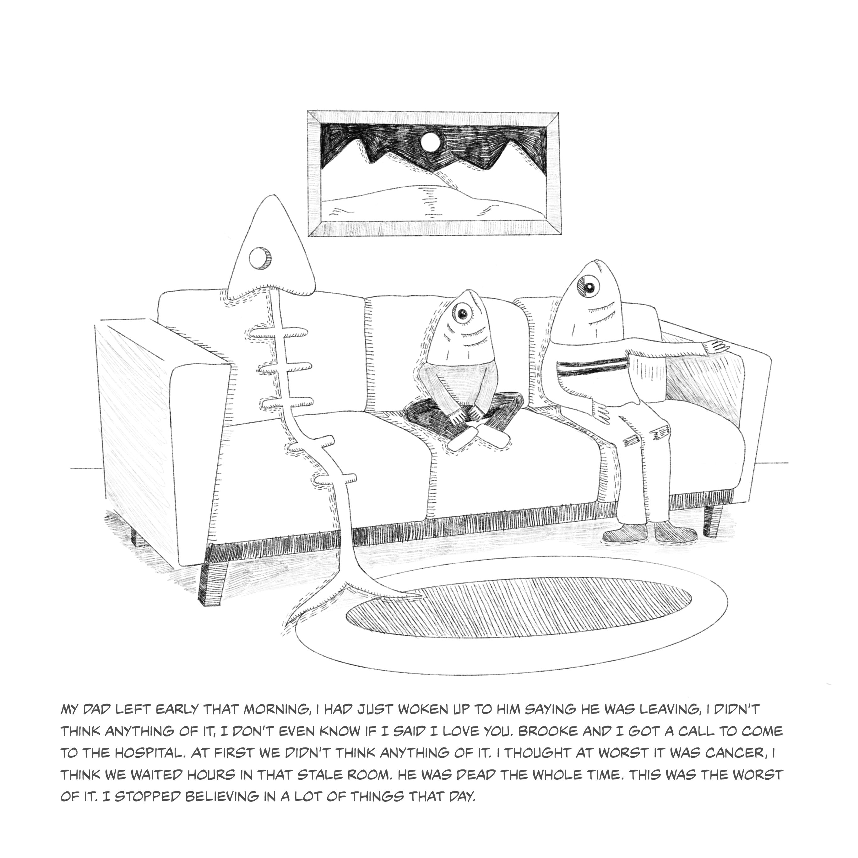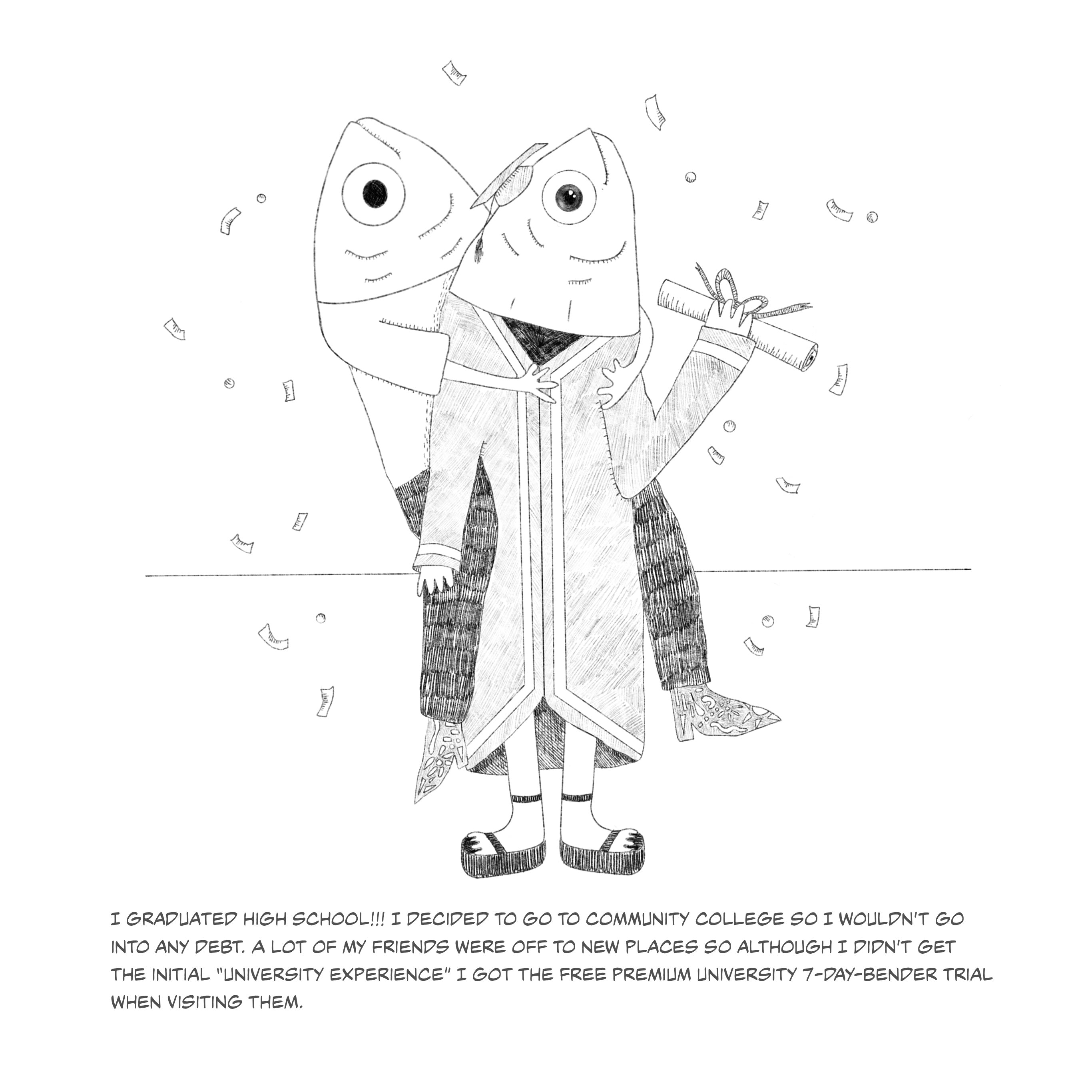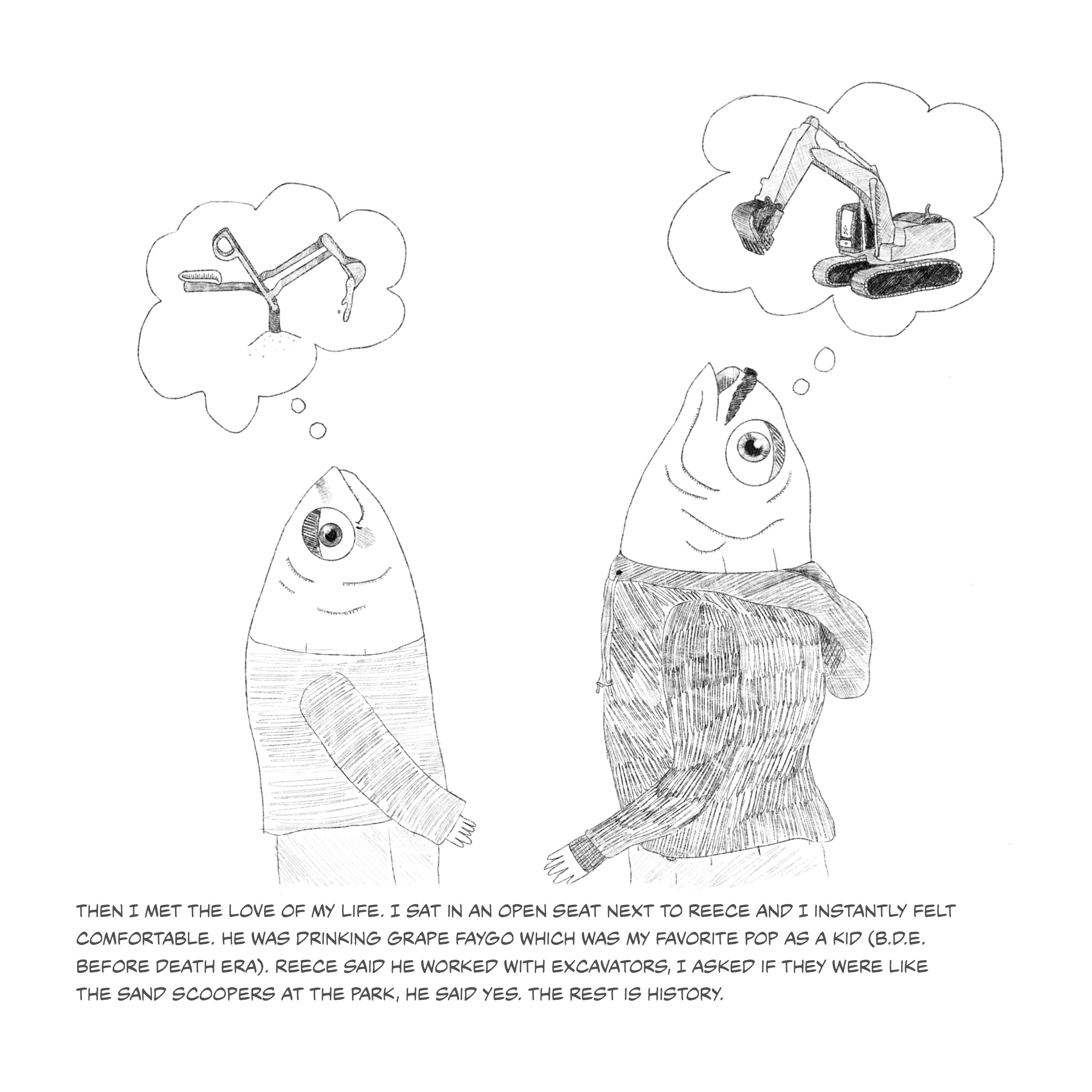 This series of fish illustrations depicts pivotal moments of life. The fish portrayed serves as a metaphor for the emotions and growth I have endured. The humorous fish illustrations contradict the narrative emphasizing my life's tragic and uplifting moments. The narratives should remind viewers of the strength of laughter, even when faced with life's hardships.