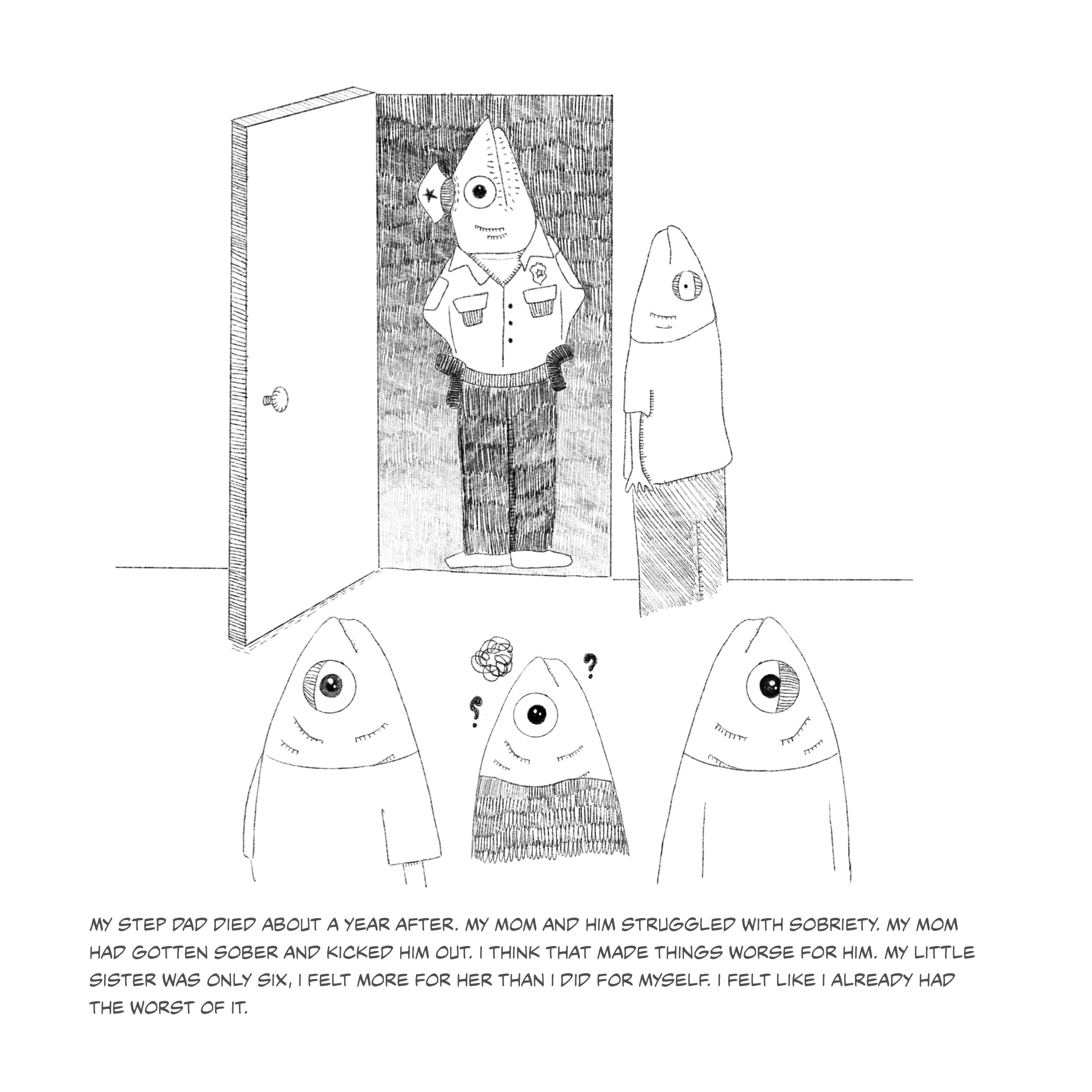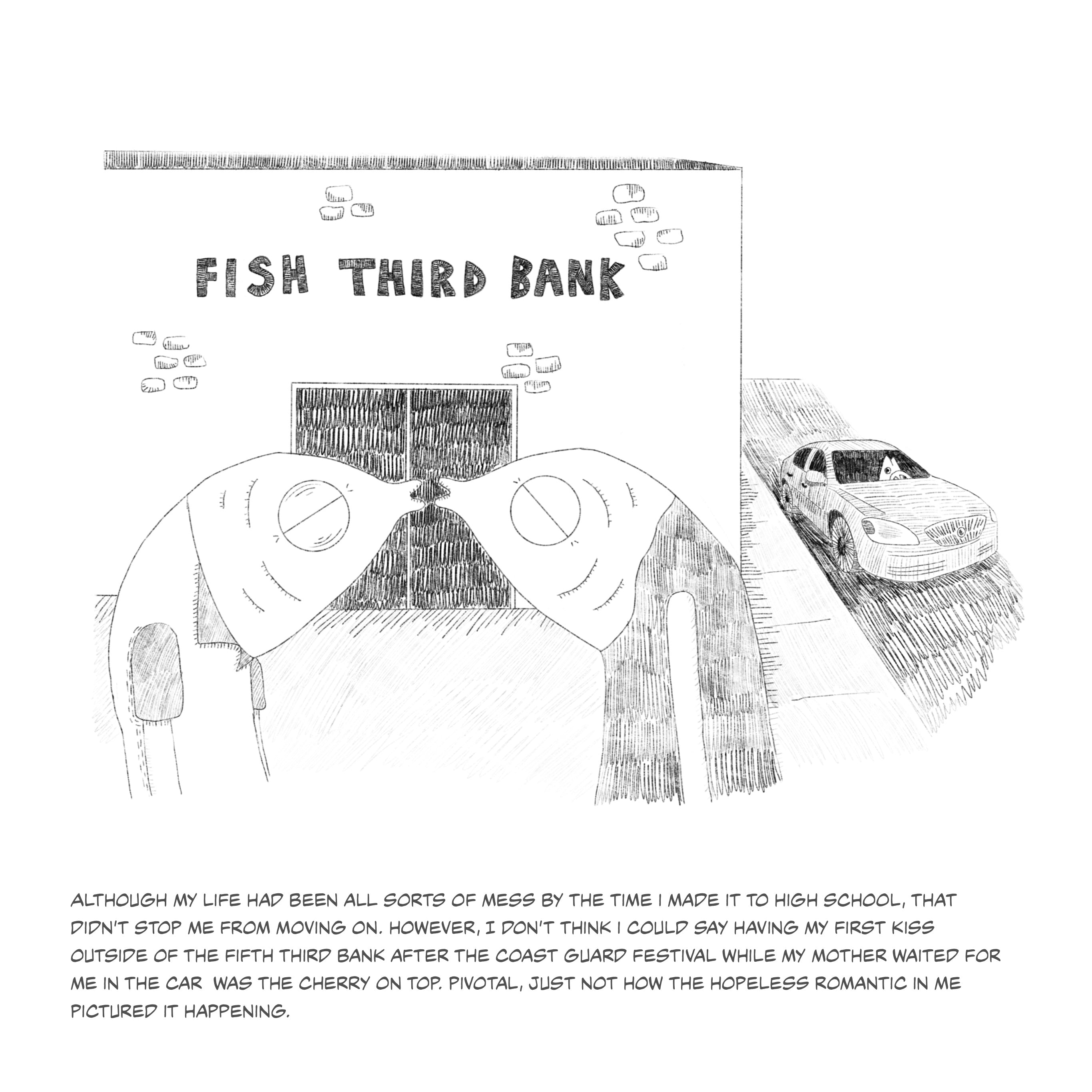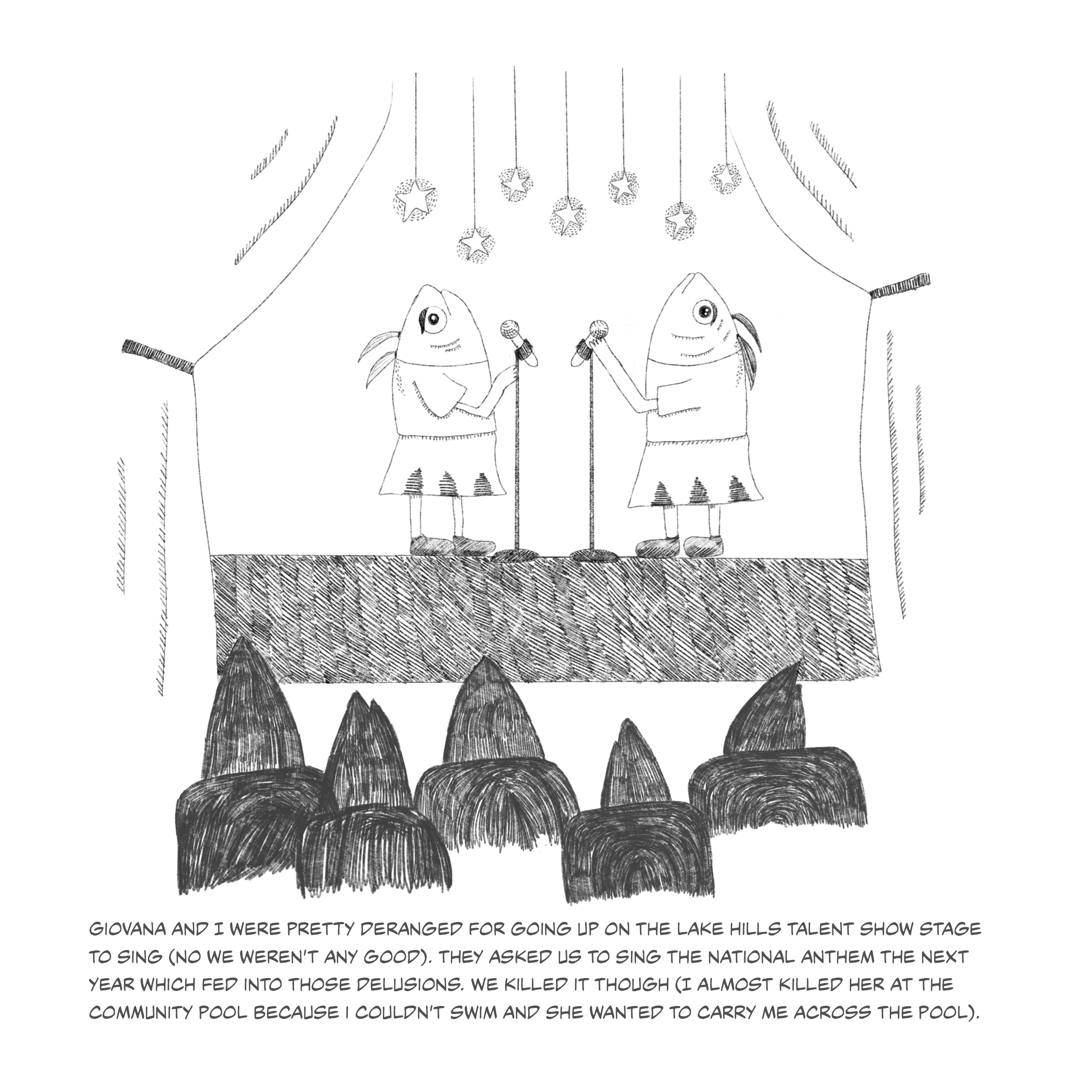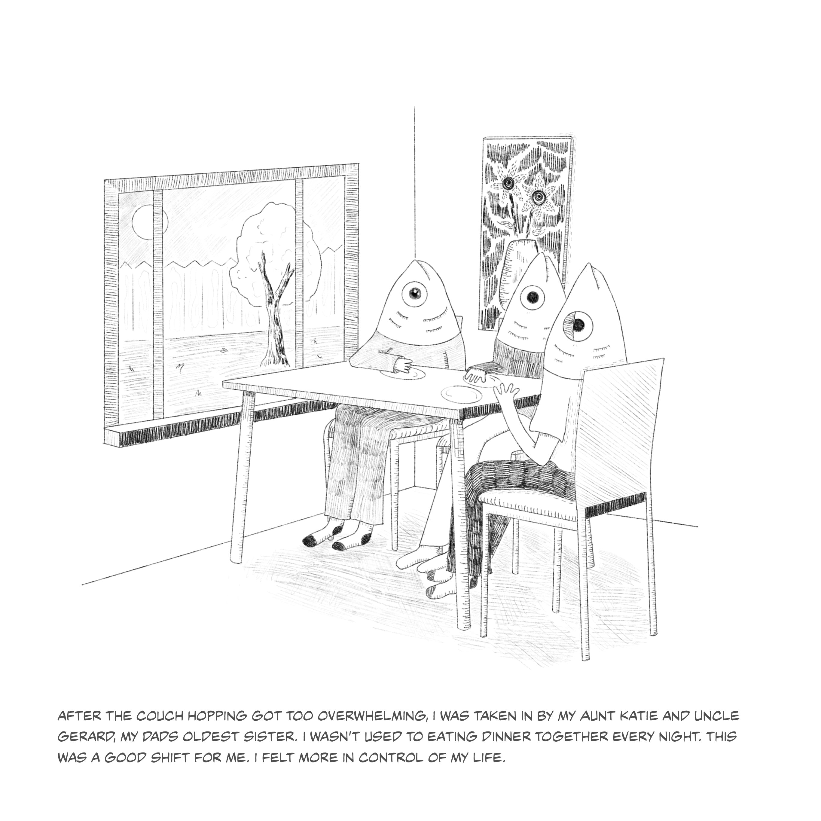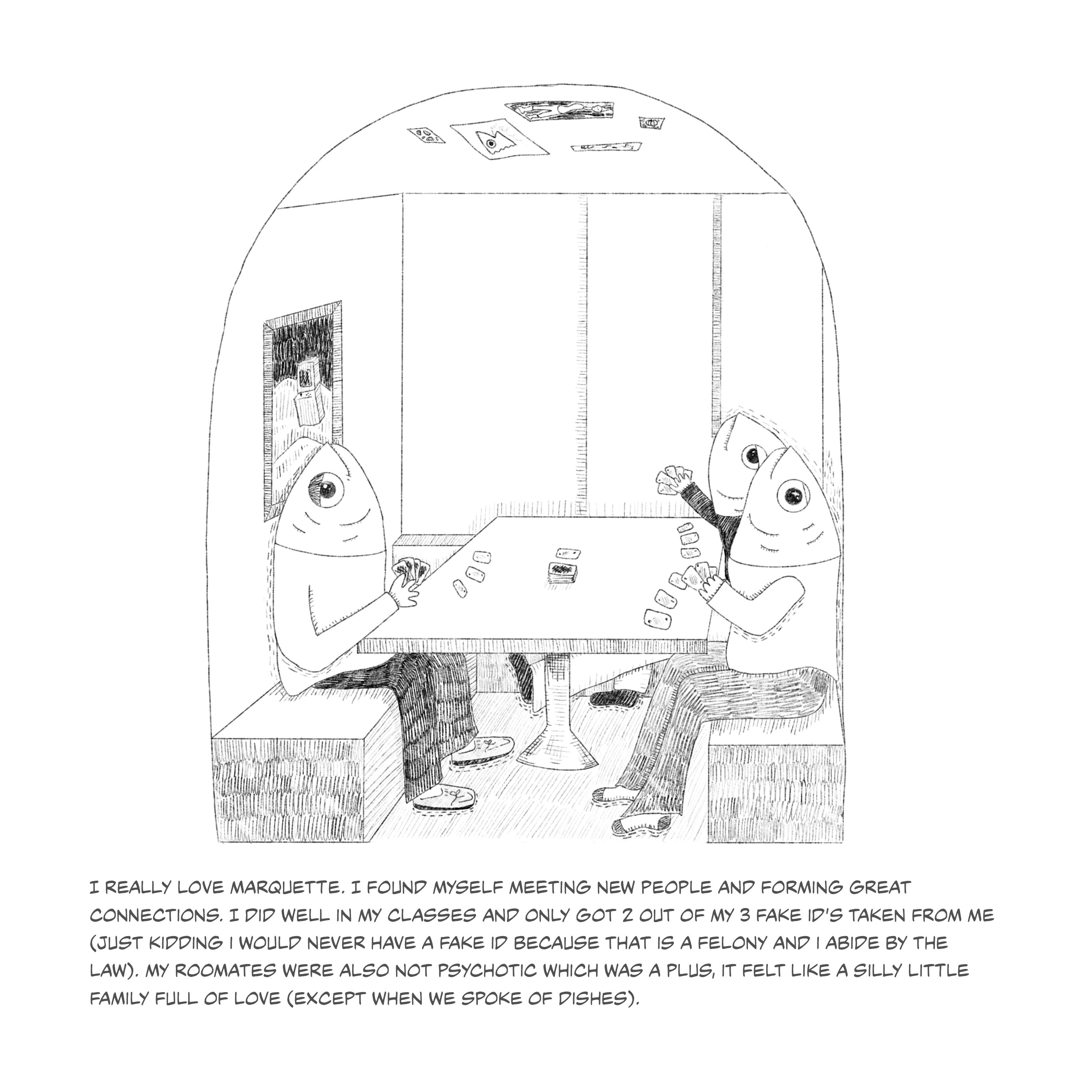 This series of fish illustrations depicts pivotal moments of life. The fish portrayed serves as a metaphor for the emotions and growth I have endured. The humorous fish illustrations contradict the narrative emphasizing my life's tragic and uplifting moments. The narratives should remind viewers of the strength of laughter, even when faced with life's hardships.