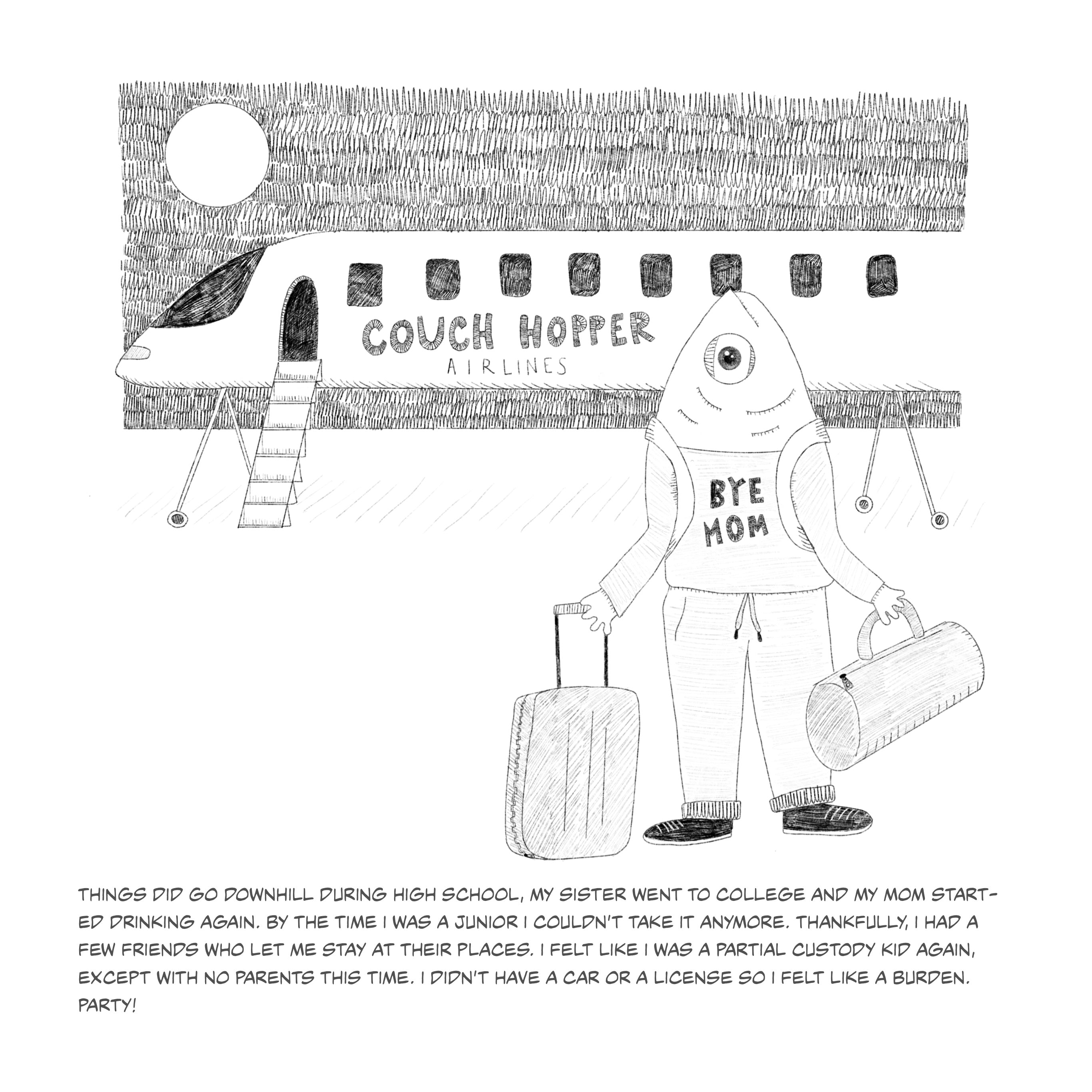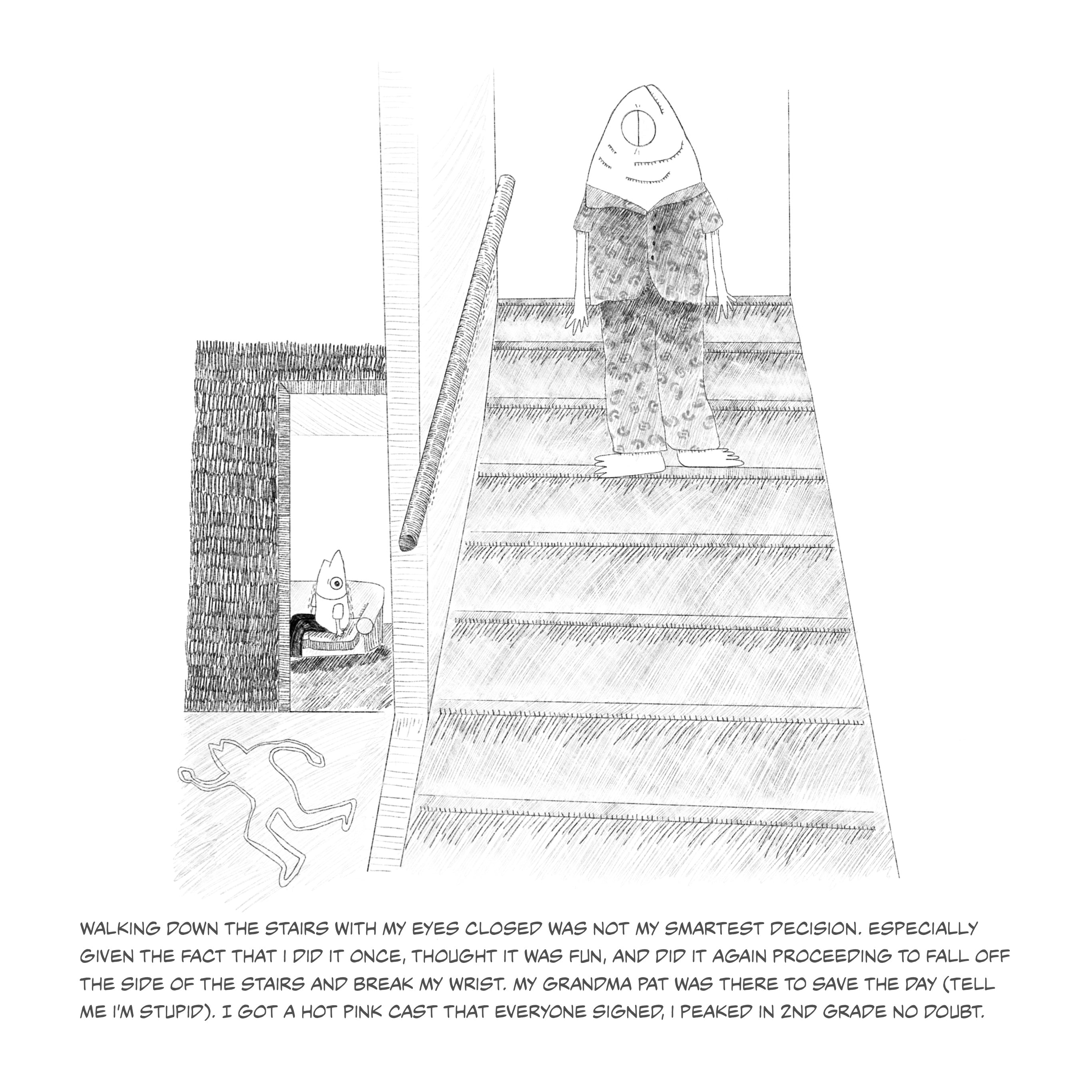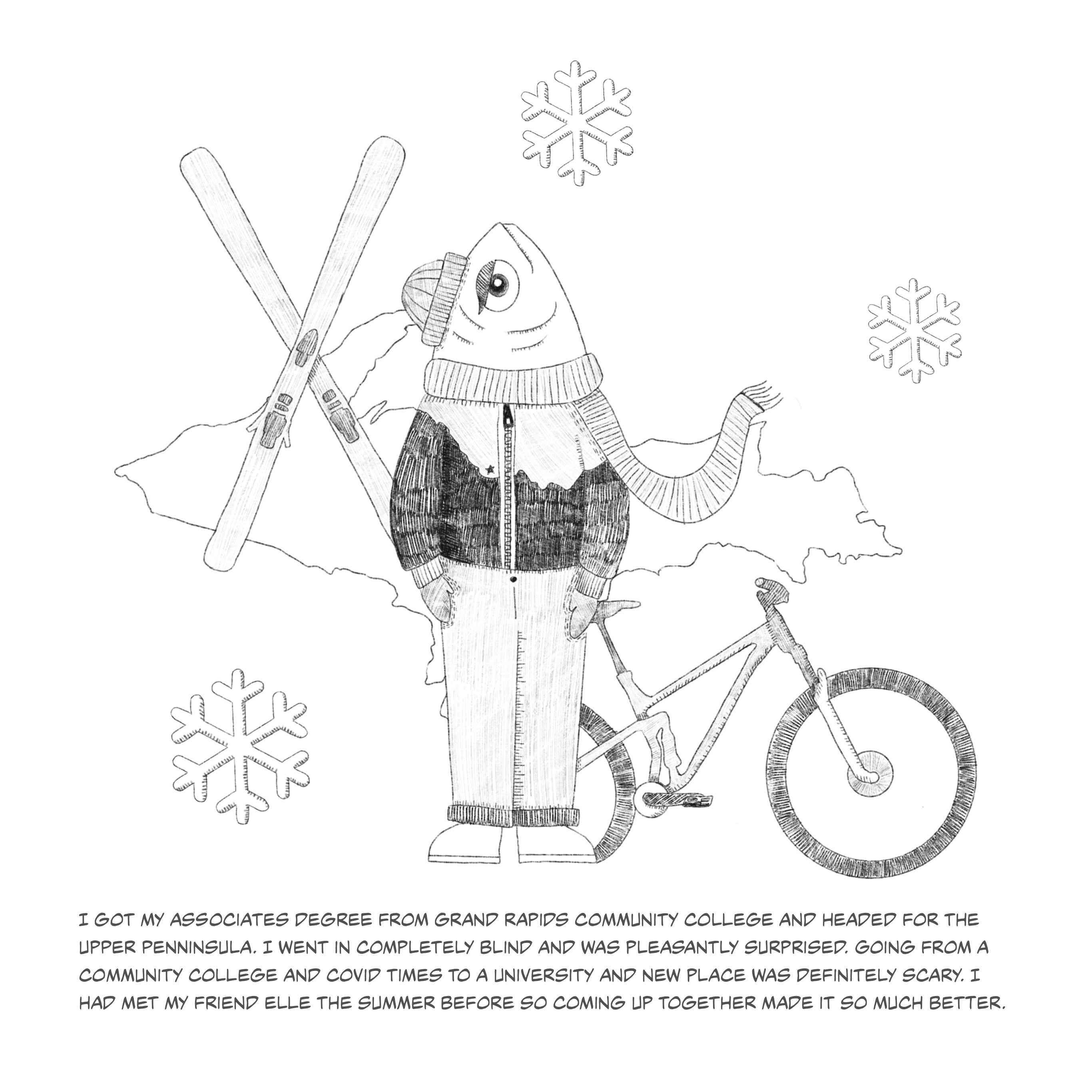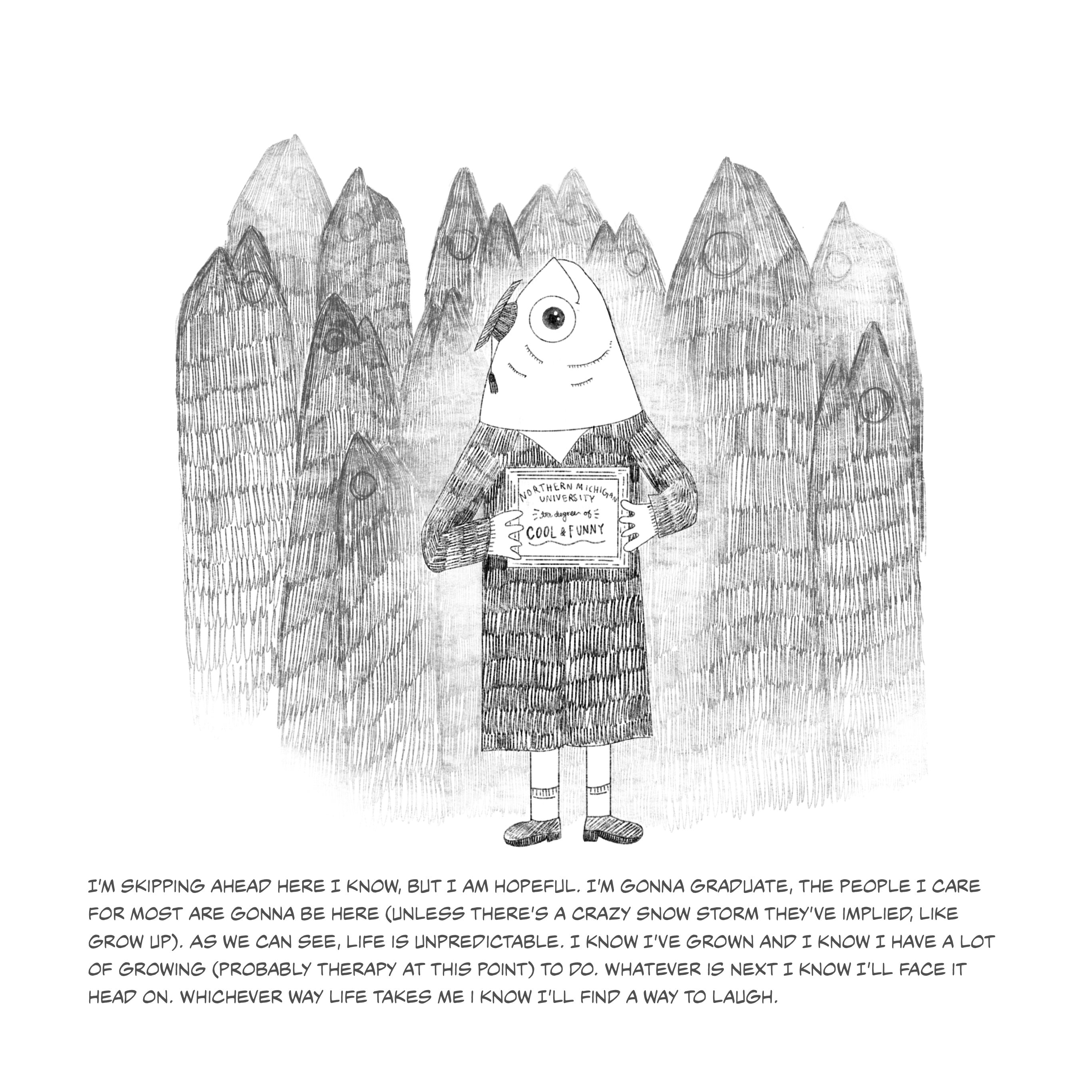 This series of fish illustrations depicts pivotal moments of life. The fish portrayed serves as a metaphor for the emotions and growth I have endured. The humorous fish illustrations contradict the narrative emphasizing my life's tragic and uplifting moments. The narratives should remind viewers of the strength of laughter, even when faced with life's hardships.