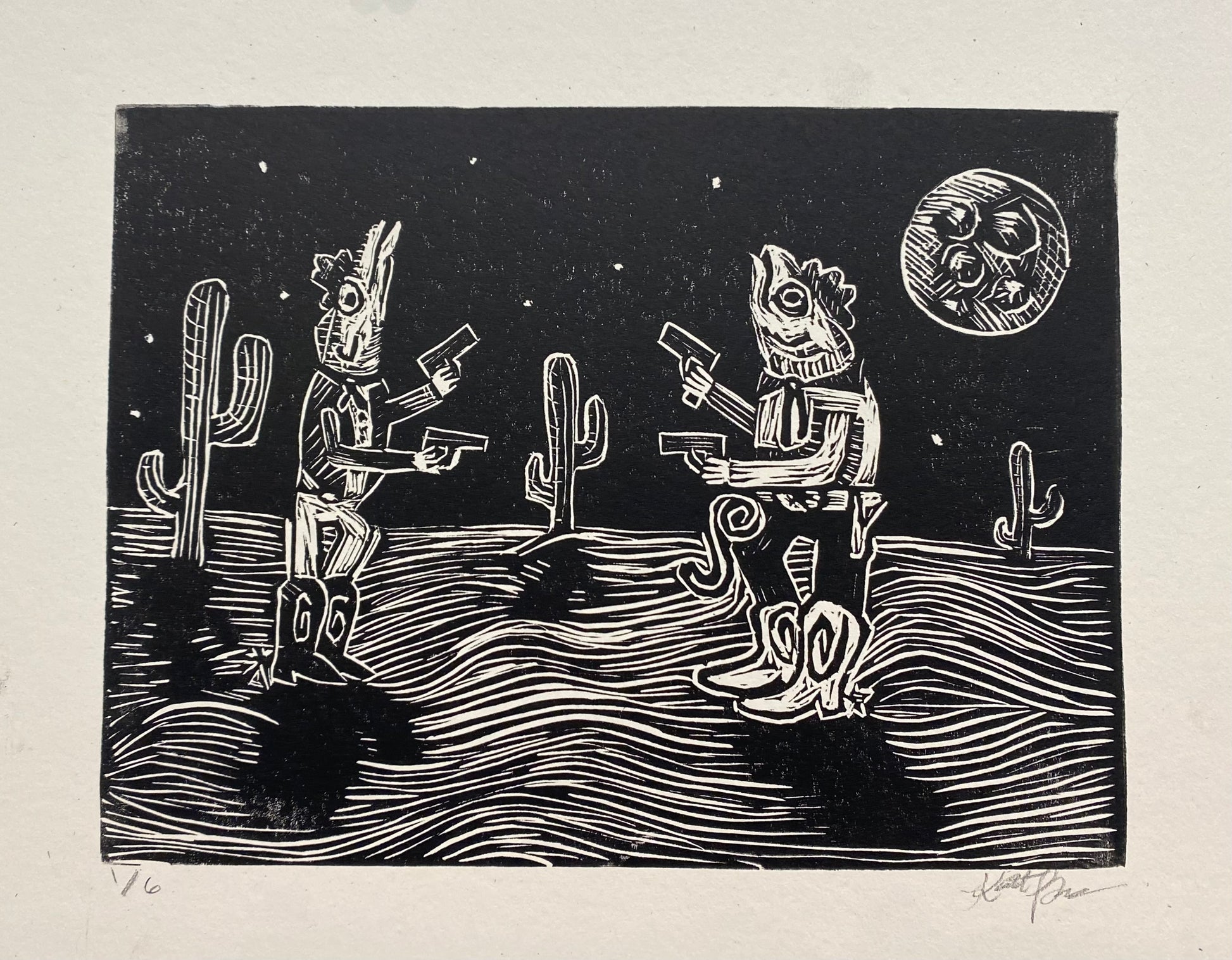 Never bring a fish to a gun fight. 8.5” x 11” block print. Inking may vary as it is a handprinted item.